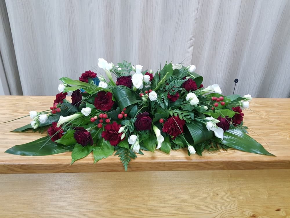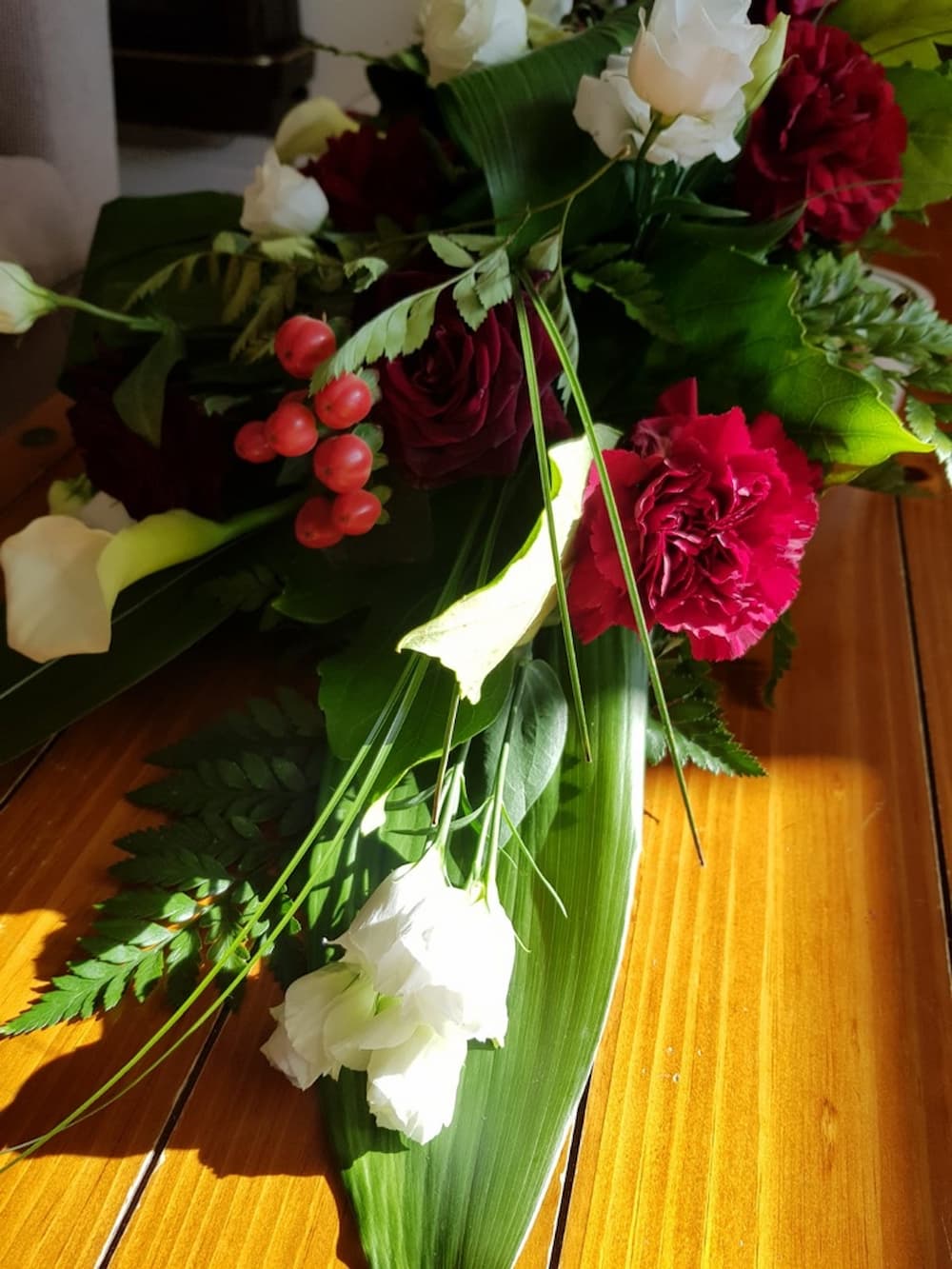bouquet of white Calla Lilies, deep red Roses (Black Bacara) Hypericum berries with foliage of Aspidistra leaves