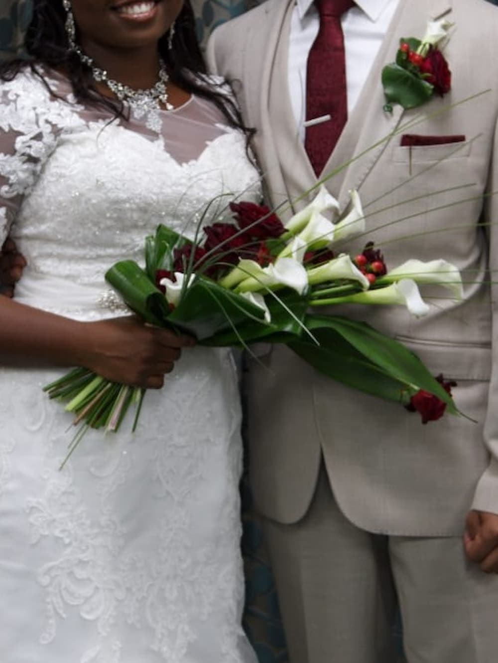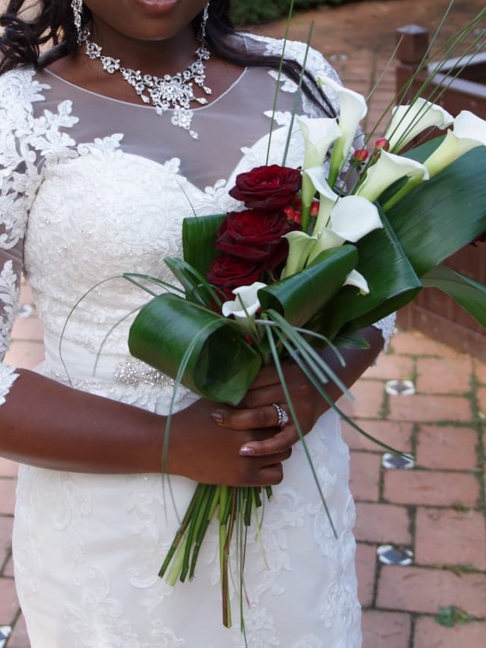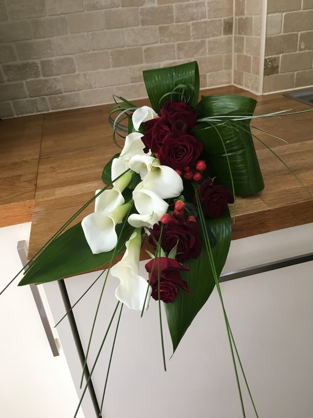 bouquet of white Calla Lilies, deep red Roses (Black Bacara) Hypericum berries with foliage of Aspidistra leaves